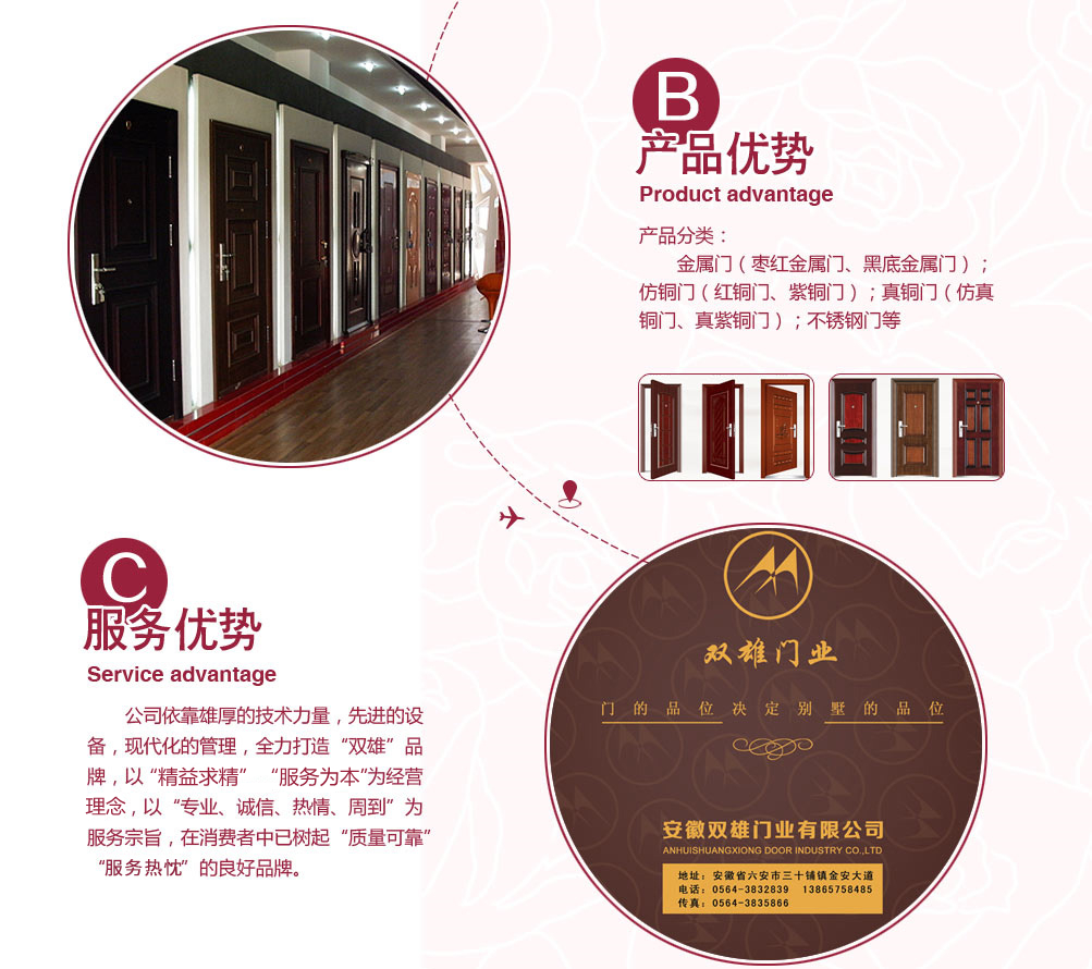 安徽六安雙雄門業(yè)有限公司成立于2006年,是一家專業(yè)從事鋼質門,天然實木門為一體的現(xiàn)代企業(yè),公司擁有先進的機械設備和專業(yè)的技術人員,以科技為依托,以市場需求為導向,大膽創(chuàng)新追求更好,全身致力于提高門業(yè)裝飾水平。公司擁有先進的機械設備和專業(yè)的技術人員,以科技為依托,以市場需求為導向,全力打造“雙雄”品牌門!產品種類繁多:金屬門(棗紅金屬門、黑底金屬門);仿銅門(紅銅門、紫銅門);真銅門(仿真銅門、真紫銅門);不銹鋼門等。公司依靠雄厚的技術力量,先進的設備,現(xiàn)代化的管理,全力打造“雙雄”品牌,以“精益求精”“服務為先”為經營理念,以“專業(yè)、誠信、熱情、周到”為服務宗旨,在消費者中已樹起良好企業(yè)形象。